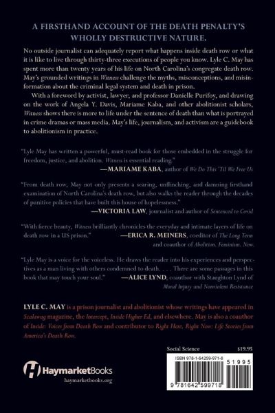 A first-hand account of the death penalty's wholly destructive nature. In Witness, Lyle C. May offers a scathing critique of shifts in sentencing laws, prison policies that ensure recidivism, and classic "tough on crime" views that don't make society safer or prevent crime. These insightful and analytical essays explore capital punishment, life imprisonment, prison education, prison journalism, as well as what activism from inside looks like on the road toward abolishing the carceral state. No outside journalist can adequately report what happens inside death row or what it is like to live through thirty-three executions of people you know. May's grounded writings in Witness challenge the myths, misconceptions, and misinformation about the criminal legal system and death in prison, guiding readers on a journey through North Carolina's congregate death row, where the author has spent over twenty years of his life. With a foreword by activist, lawyer, and professor Danielle Purifoy, and drawing on the work of Angela Y. Davis, Mariame Kaba, and other abolitionist scholars, Witness shows there is more to life under the sentence of death than what is portrayed in crime dramas or mass media. Lyle C. May's life, journalism, and activism are a guidebook to abolitionism in practice.
