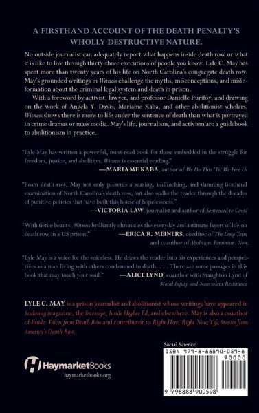 A first-hand account of the death penalty's wholly destructive nature. In Witness, Lyle C. May offers a scathing critique of shifts in sentencing laws, prison policies that ensure recidivism, and classic "tough on crime" views that don't make society safer or prevent crime. These insightful and analytical essays explore capital punishment, life imprisonment, prison education, prison journalism, as well as what activism from inside looks like on the road toward abolishing the carceral state. No outside journalist can adequately report what happens inside death row or what it is like to live through thirty-three executions of people you know. May's grounded writings in Witness challenge the myths, misconceptions, and misinformation about the criminal legal system and death in prison, guiding readers on a journey through North Carolina's congregate death row, where the author has spent over twenty years of his life. With a foreword by activist, lawyer, and professor Danielle Purifoy, and drawing on the work of Angela Y. Davis, Mariame Kaba, and other abolitionist scholars, Witness shows there is more to life under the sentence of death than what is portrayed in crime dramas or mass media. Lyle C. May's life, journalism, and activism are a guidebook to abolitionism in practice.