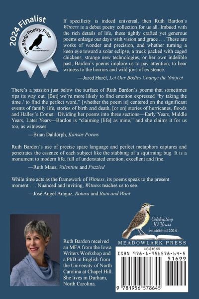 The poems in Ruth Bardon's Witness are deceptively simple; they're short and clear, and most focus on small episodes of daily life, starting with childhood and continuing into old age. The complexity comes from the ways in which the poems are infused with later knowledge, with understanding and compassion, and with a persistent awareness of the fragility and brevity of our lives. 2024 Finalist-Birdy Poetry Prize, by Meadowlark Press