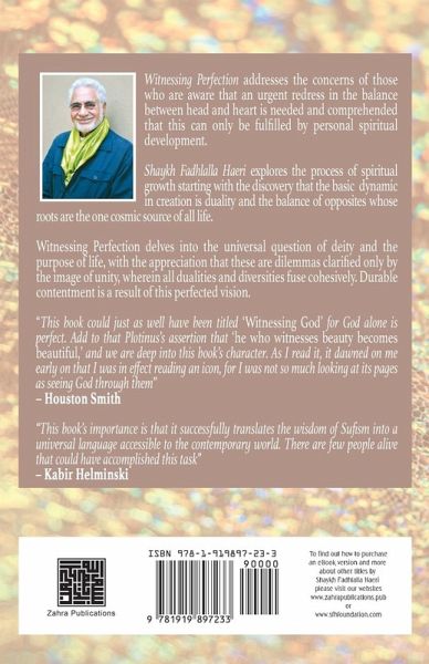 Witnessing Perfection addresses the concerns of those who are aware that an urgent redress in the balance between head and heart is needed and comprehended that this can only be fulfilled by personal spiritual development. Shaykh Fadhlalla Haeri explores the process of spiritual growth starting with the discovery that the basic dynamic in creation is duality and the balance of opposites whose roots are the one cosmic source of all life. Witnessing Perfection delves into the universal question of deity and the purpose of life, with the appreciation that these are dilemmas clarified only by the image of unity, wherein all dualities and diversities fuse cohesively. Durable contentment is a result of this perfected vision.