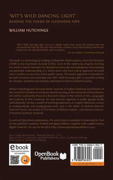 Wit's Wild Dancing Light acts as a highly useful entry point for readers who are encountering Pope for the first time and also contains much illuminating material for those who are already familiar with his poetry. -Dr Ian Calvert, University of Bristol The book is a chronological reading of Alexander Pope's poems, from the Pastorals (1709) to the four-book Dunciad (1743). Each of the 26 chapters forming the volume selects examples for detailed scrutiny, demonstrating how close reading can generate understanding of a whole poem and how critical appraisal can build into a creative survey of an entire poetic career. The book's approach is intended to be both scholarly and accessible and Wild Wit's Dancing Light will be of interest to scholars, students and anybody interested in Pope's masterful poetry. William Hutchings was formerly Senior Lecturer in English Literature and Director of the Centre for Excellence in Enquiry-Based Learning at the University of Manchester, UK and he is presently Honorary Research Fellow in the School of Arts, Languages and Cultures at that university. He now lectures regularly to public groups locally and nationally. He has a wealth of teaching experience on English Literature courses at undergraduate and postgraduate level, and is the editor of Andrew Marvell: Selected Poems, the author of The Poetry of William Cowper, and Literary Criticism: A Practical Guide for Students.