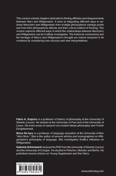 Fabio A. Sulpizio is a professor of history of philosophy at the University of Salento (Lecce). He studied at the University of Pisa and at the University of Lecce. His main areas of research are modern Italian philosophy and French Enlightenment. Moira De Iaco is a professor of language education at the University of Bari "Aldo Moro." She is the author of several articles and monographies on Wittgenstein¿s philosophy of language. She investigated Sraffäs influence on Wittgenstein. Gabriele Schimmenti received his PhD from the University of Salento (Lecce) and the University of Cologne. He studied in Palermo, Münster and Berlin. He published several articles on Young Hegelianism and Karl Marx.