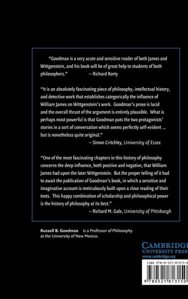 This 2002 book explores Wittgenstein's long engagement with the work of the pragmatist William James. In contrast to previous discussions Russell Goodman argues that James exerted a distinctive and pervasive positive influence on Wittgenstein's thought. For example, the book shows that the two philosophers share commitments to anti-foundationalism, to the description of the concrete details of human experience, to the priority of practice over intellect, and to the importance of religion in understanding human life. Considering in detail what Wittgenstein learnt from his reading of Principles of Psychology and Varieties of Religious Experience the author provides considerable evidence for Wittgenstein's claim that he is saying 'something that sounds like pragmatism'. This provocative account of the convergence in the thinking of two major philosophers usually considered as members of discrete traditions will be eagerly sought by students of Wittgenstein, William James, pragmatism and the history of twentieth-century philosophy.