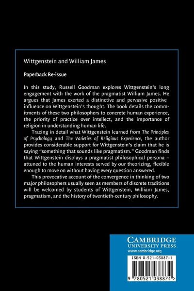 This book explores Wittgenstein's long engagement with the work of the pragmatist William James. In contrast to previous discussions Russell Goodman argues that James exerted a distinctive and pervasive positive influence on Wittgenstein's thought. For example, the book shows that the two philosophers share commitments to anti-foundationalism, to the description of the concrete details of human experience, to the priority of practice over intellect, and to the importance of religion in understanding human life. Considering in detail what Wittgenstein learnt from his reading of Principles of Psychology and Varieties of Religious Experience the author provides considerable evidence for Wittgenstein's claim that he is saying 'something that sounds like pragmatism'. This provocative account of the convergence in the thinking of two major philosophers usually considered as members of discrete traditions will be eagerly sought by students of Wittgenstein, William James, pragmatism and the history of twentieth-century philosophy.