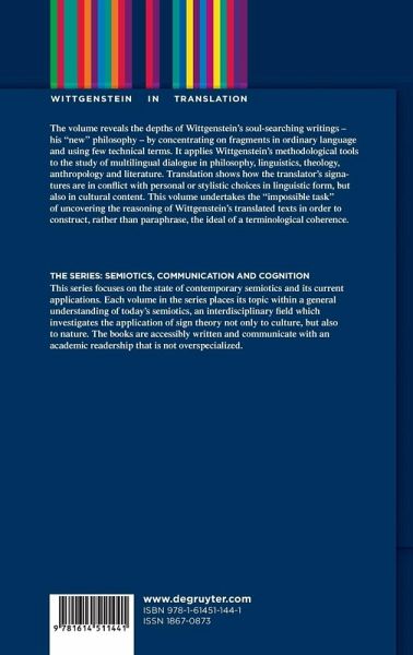 Apart from the Tractatus, Wittgenstein did not write whole manuscripts, but composed short fragments. The current volume reveals the depths of Wittgenstein's soul-searching writings - his "new" philosophy - by concentrating on ordinary language and using few technical terms. In so doing, Wittgenstein is finally given the accolade of a neglected figure in the history of semiotics. The volume applies Wittgenstein's methodological tools to the study of multilingual dialogue in philosophy, linguistics, theology, anthropology and literature. Translation shows how the translator's signatures are in conflict with personal or stylistic choices in linguistic form, but also in cultural content. This volume undertakes the "impossible task" of uncovering the reasoning of Wittgenstein's translated texts in order to construct, rather than paraphrase, the ideal of a terminological coherence.
