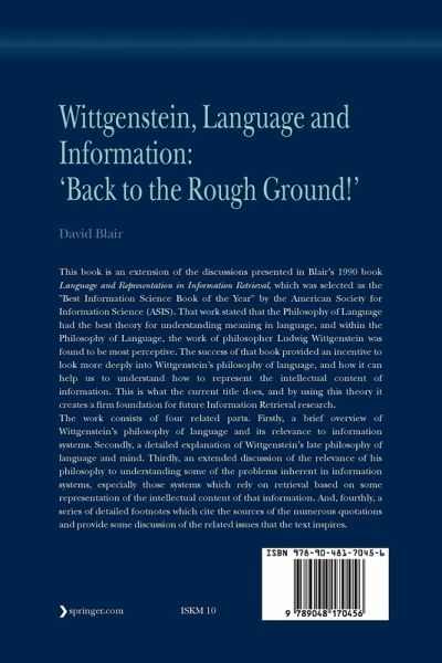 "The more narrowly we examine language, the sharper becomes the con?ict - tween it and our requirement. (For the crystalline purity of logic was, of course, not a result of investigation; it was a requirement. ) The con?ict becomes intolerable; the requirement is now in danger of becoming empty. -We have got onto slippery ice where there is no friction and so in a certain sense the conditions are ideal, but also, just because of that, we are unable to walk. We want to walk; so we need 1 friction. Back to the rough ground!" -Ludwig Wittgenstein This manuscript consists of four related parts: a brief overview of Wittgenstein's p- losophy of language and its relevance to information systems; a detailed explanation of Wittgenstein's late philosophy of language and mind; an extended discussion of the re- vance of his philosophy to understanding some of the problems inherent in information systems, especially those systems which rely on retrieval based on some representation of the intellectual content of that information. And, fourthly, a series of detailed footnotes which cite the sources of the numerous quotations and provide some discussion of the related issues that the text inspires. The ?rst three of these parts can each be read by itself with some pro?t, although they are related and do form a conceptual whole.