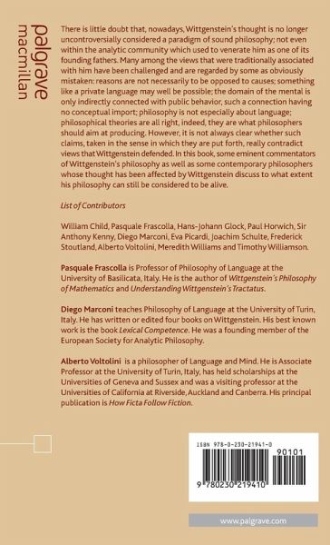 Notes on Contributors Introduction; P.Frascolla , D.Marconi & A.Voltolini PART I: MIND Rule and Exception in Wittgenstein's Philosophy of Mind; W.Child Reading-machines, Feelings of Influence, Experiences of Being Guided: Wittgenstein on Reading; J.Schulte Reasons and Causes; F.Stoutland Was Wittgenstein Wrong about Intentionality?; A.Voltolini PART II: MEANING Does Language Require Conventions?; H-J.Glock Regularities, Rules, Meanings, Truth Conditions, and Epistemic Norms; P.Horwich Wittgenstein and Necessary Facts; D.Marconi Wittgenstein and Frege on Proper Names and the Context Principle; E.Picardi Sceptical Conclusions about Epistemological Analyticity; T.Williamson PART III: METAPHILOSOPHY An Adequacy Condition for the Interpretation of the Tractatus Ontology; P.Frascolla Method and Metaphilosophy in the Philosophical Investigations; M.Williams Farewell Thoughts on Wittgenstein; A.Kenny Index