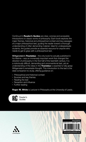Wittgenstein's Tractatus - the only book he actually published within his lifetime - was an immensely important work which changed the direction of philosophy in the first half of the twentieth century. Highlighting the importance of the nature of language in philosophy and the problematic nature of metaphysics, it strongly influenced the work of Russell, the Vienna Circle and A. J. Ayer. An understanding of the ideas in the Tractatus is essential to fully grasp Wittgenstein's remarkable thought. In Wittgenstein's 'Tractatus Logico-Philosophicus': A Reader's Guide, Roger White provides a thorough account of the philosophical and historical context of Wittgenstein's work. The book provides a detailed outline of the themes and structure of the text, guiding the reader towards a thorough understanding of this remarkable text. White goes on to explore the reception and influence of the work and offers a detailed guide to further reading. This is the ideal companion to study of this hugely important philosophical work.