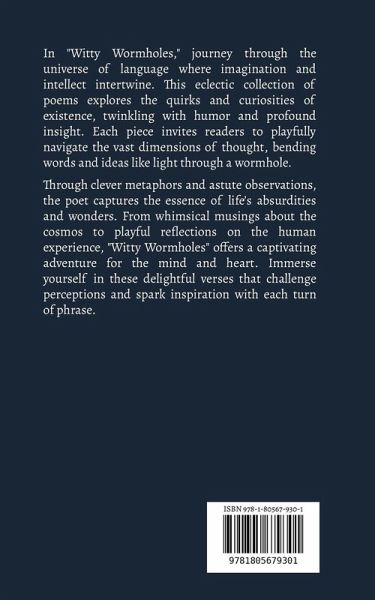 In "Witty Wormholes," journey through the universe of language where imagination and intellect intertwine. This eclectic collection of poems explores the quirks and curiosities of existence, twinkling with humor and profound insight. Each piece invites readers to playfully navigate the vast dimensions of thought, bending words and ideas like light through a wormhole. Through clever metaphors and astute observations, the poet captures the essence of life's absurdities and wonders. From whimsical musings about the cosmos to playful reflections on the human experience, "Witty Wormholes" offers a captivating adventure for the mind and heart. Immerse yourself in these delightful verses that challenge perceptions and spark inspiration with each turn of phrase.