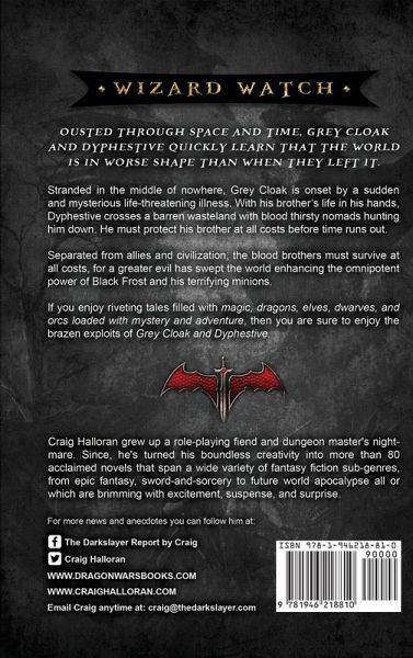Ousted through space and time, Grey Cloak and Dyphestive quickly learn that the world is in worse shape than when they left it. Stranded in the middle of nowhere, Grey Cloak is onset by a sudden and mysterious life-threatening illness. With his brother's life in his hands, Dyphestive crosses a barren wasteland with blood thirsty nomads hunting him down. He must protect his brother at all costs before time runs out. Separated from allies and civilization, the blood brothers must survive at all costs, for a greater evil has swept the world enhancing the omnipotent power of Black Frost and his terrifying minions. If you enjoy riveting tales filled with magic, dragons, elves, dwarves, and orcs loaded with mystery and adventure, then you are sure to enjoy the brazen exploits of Grey Cloak and Dyphestive.