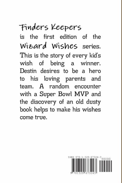 Finders Keepers is the first edition of the Wizard Wishes series. This is the story of every kid's wish of being a winner. Destin desires to be a hero to his loving parents and team. A random encounter with a Super Bowl MVP and the discovery of an old dusty book helps to make his wishes come true.