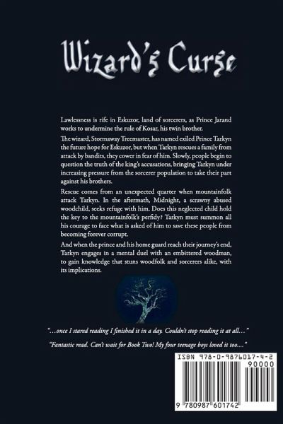 Wizard’s Curse continues the saga of Tarkyn, Guardian of the Forest. Suitable readers of all ages from proficient 11year olds upwards. Reviled by Ekuzor’s sorcerers, Prince Tarkyn dismisses his wizard’s belief that he is the future hope for the nation. In fact, when Tarkyn steps in to protect a sorcerer family under attack by bandits, he finds them cowering in fear of him. But banditry and lawlessness are becoming widespread as King Kosar’s rule is undermined by his twin brother Jarand. Gradually, people begin to question the truth of the king’s accusations against Tarkyn, placing him under increasing pressure to take up the sorcerers’ cause against his brothers. But his more immediate concerns are those of the woodfolk, whom he is sworn to protect. Tarkyn’s efforts, as forest guardian, to heal a woodfolk family go disastrously wrong; destroying a swathe of forest and nearly killing him. Worse still, the unbridled power he draws on to retrieve the situation threatens to distance him from his woodfolk companions while Danton, Tarkyn’s sorcerer liegeman, finds his life threatened by the clash between sorcerer and woodfolk expectations. As Tarkyn and his homeguard continue their trek across the mountains to retrieve Falling Rain from unjust exile, mountainfolk attack Tarkyn and drug his companions. But something more than resentment of Tarkyn is wrong with these mountainfolk. Tarkyn rescues Midnight, a silent, scrawny woodchild from abuse and neglect. Does this child hold the key to the mountainfolk’s perfidy? Tarkyn must summon all his courage to face what will be asked of him to save these people from becoming forever corrupt. And when the prince and his homeguard reach their journey’s end, Tarkyn must lay bare his innermost suffering as he engages in a mental duel with an embittered woodman, to gain knowledge that will stun woodfolk and sorcerers alike with its implications.