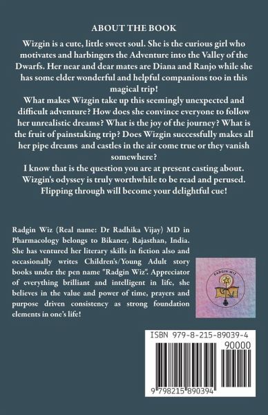 Wizgin is a cute, little sweet soul. She is the curious girl who motivates and harbingers the Adventure into the Valley of the Dwarfs. Her near and dear mates are Diana and Ranjo while she has some elder wonderful and helpful companions too in this magical trip! What makes Wizgin take up this seemingly unexpected and difficult adventure? How does she convince everyone to follow her unrealistic dreams? What is the joy of the journey? What is the fruit of painstaking trip? Does Wizgin successfully makes all her pipe dreams and castles in the air come true or they vanish somewhere? I know that is the question you are at present casting about. Wizgin's odyssey is truly worthwhile to be read and perused. Flipping through will become your delightful cue!