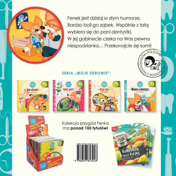 Fenek jest dzisiaj w z¿ym humorze. Bardzo boli go z¿bek. Wspólnie z tat¿ wybiera si¿ do pani dentystki. W jej gabinecie czeka na Was pewna niespodzianka... Przekonajcie si¿ sami! Dzi¿ki tej ksi¿¿ce Twoje dziecko:Dowie si¿, co nale¿y robi¿, a czego unikä, by mie¿ zdrowe z¿bki. Oswoi si¿ z gabinetem stomatologicznym i dowie si¿, ¿e nie ma si¿ czego bä. Zacznie kojarzy¿ wizyt¿ u dentysty z czym¿ przyjemnym i wesöym. Poza dostosowan¿ do wieku dzieci tre¿ci¿ i pi¿knymi, kolorowymi ilustracjami, ksi¿¿ka zawiera równie¿ wiele dodatkowych materiäów:Pomys¿y na ciekawe sp¿dzenie czasu z dzieckiem po przeczytaniu ksi¿¿eczki. Wypowiedzi eksperta Nasze bajki to idealny sposób na przyjemne, ale i efektywne sp¿dzenie czasu z maluchem. To nie tylko bajka "do poduszki", ale cö o wiele wi¿cej. Nie tylko ksi¿¿eczka do jednorazowego przeczytania, a pomoc edukacyjna i wychowawcza.