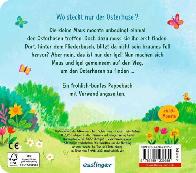 Die kleine Maus möchte unbedingt einmal den Osterhasen treffen. Dort, hinter dem Fliederbusch, blitzt da nicht ein Stückchen braunes Fell hervor? Das ist bestimmt der Osterhase! Aber nein, das ist nur der Igel! Nun machen sich Maus und Igel gemeinsam auf den Weg, um den Osterhasen zu finden ...