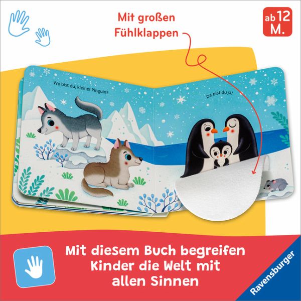 In Eis und Schnee leben viele spannende Tiere. Das Walross ruht sich auf einer Eisscholle aus und die Schneehasen hoppeln fröhlich herum. Doch wo ist der kleine Pinguin? Versteckt er sich vielleicht hinter dem Eisberg? Bereits kleine Kinderhände öffnen spielend leicht die stabilen, speichelfesten Fühlklappen aus dickem Stoff und finden es heraus. Ein kurzes Frage-Antwort-Spiel weckt dabei die Neugier der Kleinsten und unterstützt spielerisch beim Sprechenlernen.
