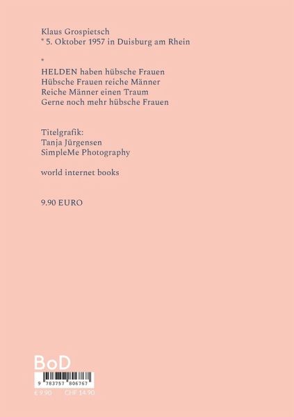 BIO & BIBLIO Klaus Grospietsch _ 5. Oktober 1957 in Duisburg am Rhein in Hochfeld > Den großen Teil meiner Jugend verbrachte ich dort mit Straßenfußball. < Er ist Mitbegründer der hfn-jam, der Kultveranstaltung im Ruhrorter Hafenmit über hundert Events im Hübi am Hafen. Sein erstes Buch heißt Königspudel mögen keinen Jazz. KG wirkte mit beim Akzente-Festival (NRW) in Duisburg am Rhein (GERMANY).Klaus Grospietsch bekannt für seine Songtexte, Malerei, Musik, Dichtkunst :_HELDEN haben hübsche FrauenHübsche Frauen reiche Männer Reiche Männer einen Traum Gerne noch mehr hübsche Frauen _ _ Titelgrafik : Tanja Jürgensen (SimpleMe Photography - Tanja Jürgensen ) _ _ world internet books Niederrheinische Dichtkunst Band 2 _9.90 EURO