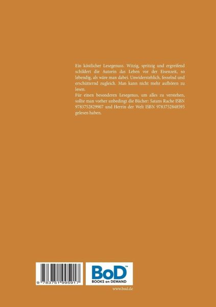 Ein köstlicher Lesegenuss. Witzig, spritzig und ergreifend schildert die Autorin das Leben vor der Eisenzeit, so lebendig, als wäre man dabei. Unwiderstehlich, fesselnd und erschütternd zugleich. Man kann nicht mehr aufhören zu lesen. Für einen besonderen Lesegenus, um alles zu verstehen, sollte man vorher unbedingt die Bücher: Satans Rache ISBN 9783752829907 und Herrin der Welt ISBN 9783752848595 gelesen haben.