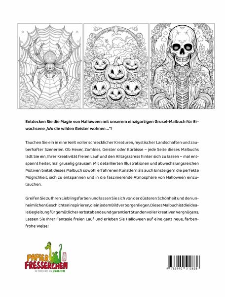 Entdecken Sie die Magie von Halloween mit unserem einzigartigen Grusel-Malbuch für Erwachsene "Wo die wilden Geister wohnen ..."!Tauchen Sie ein in eine Welt voller schrecklicher Kreaturen, mystischer Landschaften und zauberhafter Szenerien. Ob Hexer, Zombies, Geister oder Kürbisse - jede Seite dieses Malbuchs lädt Sie ein, Ihrer Kreativität freien Lauf und den Alltagsstress hinter sich zu lassen - mal entspannt heiter, mal gruselig grausam. Mit detaillierten Illustrationen und abwechslungsreichen Motiven bietet dieses Malbuch sowohl erfahrenen Künstlern als auch Einsteigern die perfekte Möglichkeit, sich zu entspannen und in die faszinierende Atmosphäre von Halloween einzutauchen.Greifen Sie zu Ihren Lieblingsfarben und lassen Sie sich von der düsteren Schönheit und den unheimlichen Geschichten inspirieren, die in jedem Bild verborgen liegen. Dieses Malbuch ist die ideale Begleitung für gemütliche Herbstabende und garantiert Stunden voller kreativen Vergnügens.Lassen Sie Ihrer Fantasie freien Lauf und erleben Sie Halloween auf eine ganz neue, farbenfrohe Weise!
