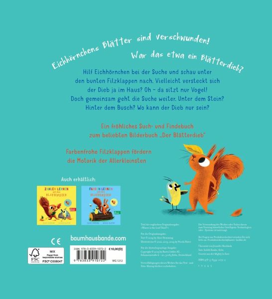 Hinter welchem Busch steckt der Blätterdieb?Oh nein - Eichhörnchens geliebte Blätter sind verschwunden! Ob sich da wieder ein Blätterdieb herumtreibt? Zusammen mit Vogel beginnt die Suche - aber wo sollen sie nur anfangen? Vielleicht im Haus? Unter einem Stein? Oder hinter einem Busch?Die bunten Filzklappen laden kleine Entdeckerinnen und Entdecker ab 2 Jahren zum Mitraten, Suchen und Staunen ein. Ein fröhliches Pappbilderbuch zum Anfassen, Mitmachen und Immer-wieder-Ansehen!- Erste Mitmach-Geschichte mit den Helden aus "Der Blätterdieb" - Mit stabilen, farbenfrohen Filzklappen zum spielerischen Entdecken- Fördert Feinmotorik, Sprachentwicklung und Beobachtungsgabe- Lustiger Vorlesespaß für kleine Kinderhände ab 2 Jahren- Perfekt für alle kleinen Naturforscher - und ein liebevoller Einstieg in die Welt von Eichhörnchen & VogelJetzt mitraten, mitklappen und den Blätterdieb finden!