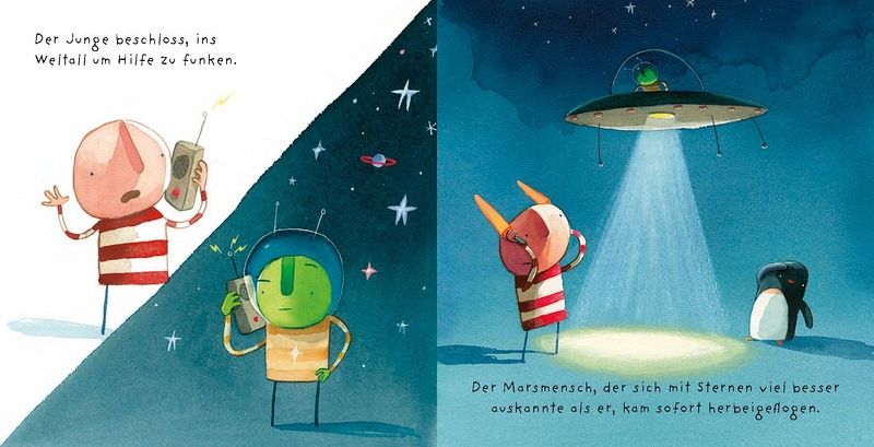Es war einmal ein Junge, der oft mit seinen Freunden, dem Stern und dem Pinguin, Verstecken spielte ... Der Stern war eigentlich immer leicht zu finden, aber eines Tages war er verschwunden. Also funkte der Junge den Marsmenschen um Hilfe an, und schon saß er an Bord eines Raumschiffs, um eine aufregende Rettungsmission zum Nordpol zu unternehmen!