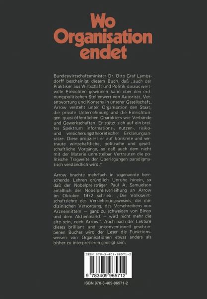 Das nunmehr in deutscher Ubersetzung vorliegende Buch "Limits of Organization" von K. J. Arrow erschlieBt Grundbeziehungen des menschlichen Handelns, indem die Spannungen zwischen Individuum und Gesellschaft, die aus unterschiedlichem Rollenverhalten im Gefiige der Gesellschaft entstehen, untersucht werden. Obwohl Arrow seine Diktion eng an die Fachterminologie anlehnt, meine ich, daB auch der Praktiker aus Wirtschaft und Politik daraus wertvolle Einsichten gewin nen kann iiber den ordnungspolitischen Stellenwert von Autoritat, Ver antwortung und Konsens in unserer Gesellschaft. Arrow legt als zentrale Hypothese die des rationalen Ziel-Mittelverhal tens zugrunde. 1m Mittelpunkt steht die Organisation als Instrument zielgerichteten Handelns eines Kollektivs, vor allem die Bedingungen, unter denen sie - im Kontrast zum Preis system - effizient ist. Kon gruenz und Dissonanz von Ziel und Mittel sind Gegenstand der Re flexion, nicht die Arbeit und die Beschaffenheit der Ziele selbst. Als Organisation versteht Arrow den Staat, die private Unternehmung und die Einrichtungen quasi-offentlichen Charakters wie Verbande und Ge werkschaften. Arrows Arbeit erinnert mich an die angelsachsische Tra dition der "Political Economy". Arrow stiitzt sich auf ein breites Spek trum informations-, nutzen-, risiko-und versicherungstheoretischer Er klarungsansatze. Diese projiziert er auf konkrete und vertraute wirt schaftliche, politische und gesellschaftliche Vorgange, so daB auch dem nicht mit der Materie unmittelbar Vertrauten die politische Tragweite der Uberlegungen paradigmatisch verstandlich wird. Dr. Otto Graf Lambsdorff Bundeswirtschaftsminister 5 Inhaltsverzeichnis Vorwort von Dr. Otto Graf Lambsdorff . . . . . . . . . . . . . . . . . . . . 5 1. Rationalitat: individuell und sozial gesehen . . . . . . . . . . . . . . 9 2. Organisation und Information . . . . . . . . . . . . . . . . . . . . . . . . 29 3. Agenda von Organisationen . . . . . . . . . . . . . . . . . . . . .. . . . . 43 4. Autoritat und Verantwortung . . . . . . . . . . . . . . . . . . . . . . . . 61 Literaturverzeichnis . . . . . . . . . . . . . . . . . . . . . . . . . . . . . 83 . . . . . .