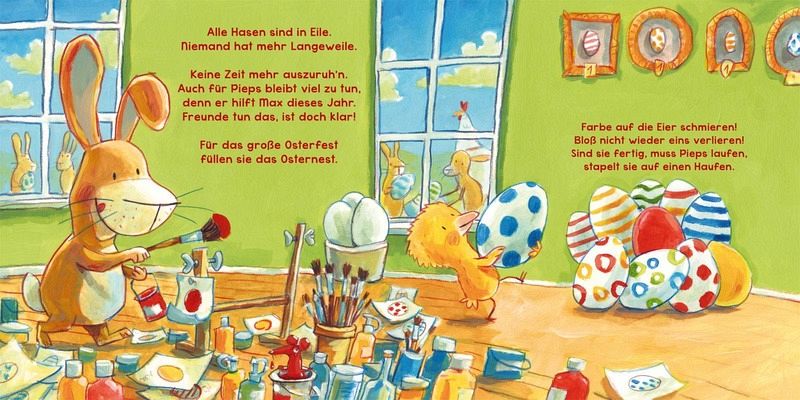 Alle Hasen sind in Eile. Niemand hat mehr Langeweile. Für das große Osterfest füllen Osterhase Max und sein Freund Pieps die Osternester. Doch dann passiert ein Missgeschick und alle Eier rollen davon. Jetzt rennen alle Tiere hinterher, um sie wieder einzusammeln. Bis nur noch ein Ei übrig bleibt. Als dieses zerbricht, gibt es eine Überraschung: Ein Schnabeltier schlüpft heraus.