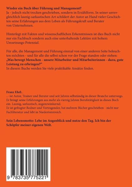 Wieder ein Buch über Führung und Management? Ja - jedoch nicht trocken geschrieben, sondern in Erzählform. In seiner unvergleichlich launisch-sarkastischen Art schildert der Autor an Hand vieler Geschichten seine Erfahrungen aus dem Leben als Führungskraft und Berater von Unternehmen. Hinterlegt mit Fakten und wissenschaftlichen Erkenntnissen ist dies Buch nicht nur ein Fachbuch sondern auch eine unterhaltende Lektüre mit hohem Umsetzungs-Potenzial. Für alle die Management und Führung einmal von einer anderen Seite beleuchten möchten - und für alle die selbst schon vor der Frage standen oder stehen: "Was bewegt Menschen - unsere Mitarbeiter und Mitarbeiterinnen - dazu, gute Leistung zu erbringen". Dazu liefert dieses Buch viele praktikable Ansätze.