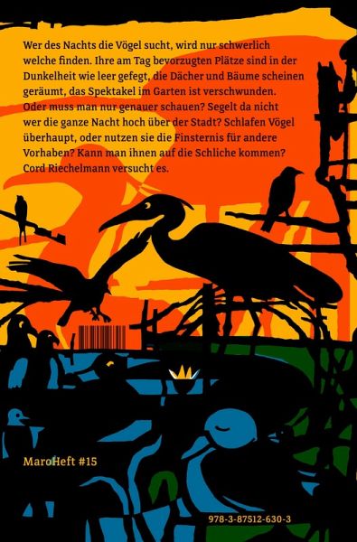 Wer des Nachts die Vögel sucht, wird nur schwerlich welche finden. Ihre am Tag bevorzugten Plätze sind in der Dunkelheit wie leergefegt, die Dächer und Bäume scheinen geräumt, das Spektakel des sommerlichen Gartens ist verschwunden. Oder muss man nur genauer schauen? Segelt da nicht wer die ganze Nacht hoch über der Stadt? Welcher Vogel versteckt sich wo Schlafen Vögel überhaupt, oder nutzen sie die Dunkelheit für andere Vorhaben? Stimmt das Gerücht, dass einige von ihnen eine konspirative Gemeinschaft in abgelegenen Bäumen aufsuchen, um sich angeregt auszutauschen? Worüber? Kann man ihnen auf die Schliche kommen? Cord Riechelmann versucht es.