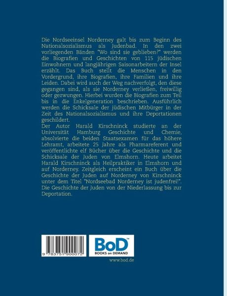 Die Nordseeinsel Norderney galt bis zum Beginn des Nationalsozialismus als Judenbad. In den zwei vorliegenden Bänden "Wo sind sie geblieben?" werden die Biografien und Geschichten von 115 jüdischen Einwohnern und langjährigen Saisonarbeitern der Insel erzählt. Das Buch stellt die Menschen in den Vordergrund, ihre Biografien, ihre Familien und ihre Leiden. Dabei wird auch der Weg nachverfolgt, den diese gegangen sind, als sie Norderney verließen, freiwillig oder gezwungen. Hierbei wurden die Biografien zum Teil bis in die Enkelgeneration beschrieben. Ausführlich werden die Schicksale der jüdischen Mitbürger in der Zeit des Nationalsozialismus und ihre Deportationen geschildert.