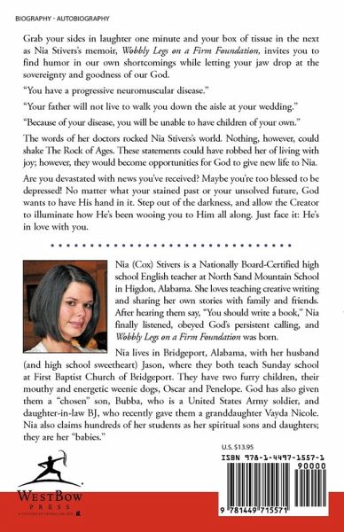 Grab your sides in laughter one minute and your box of tissue in the next as Nia Stivers's memoir, Wobbly Legs on a Firm Foundation, invites you to find humor in our own shortcomings while letting your jaw drop at the sovereignty and goodness of our God. "You have a progressive neuromuscular disease." "Your father will not live to walk you down the aisle at your wedding." "Because of your disease, you will be unable to have children of your own." The words of her doctors rocked Nia Stivers's world. Nothing, however, could shake The Rock of Ages. These statements could have robbed her of living with joy; however, they would become opportunities for God to give new life to Nia. Are you devastated with news you've received? Maybe you're too blessed to be depressed! No matter what your stained past or your unsolved future, God wants to have His hand in it. Step out of the darkness, and allow the Creator to illuminate how He's been wooing you to Him all along. Just face it: He's in love with you.