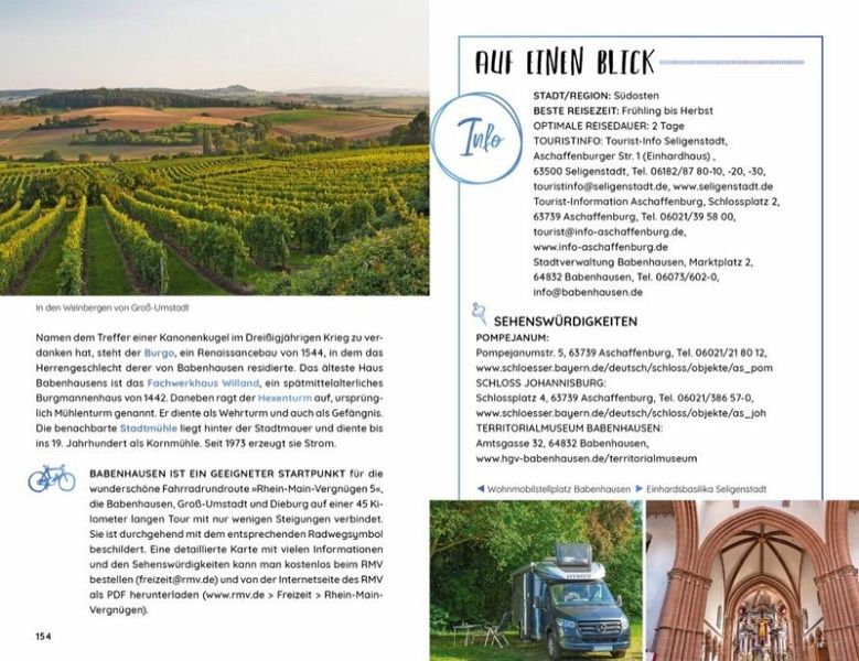 Die schönsten und besten Kurztrips mit dem Wohnmobil oder Camper. Zahlreiche Tipps zu jeder Menge abwechslungsreicher Aktivitäten und alle Infos zu den besten Stellplätzen oder Campingplätzen vor Ort machen diesen Reiseführer zum idealen Begleiter für den Kurzurlaub. Mit Wochendtouren für 2 bis 3 Tage. Zwischen Rheingau, Taunus, Spessart und Reinhessen breitet sich das wunderschöne Rhein-Main-Gebiet aus. Mit der Metropole Frankfurt und den Großstädten Mainz, Wiesbaden und Darmstadt, die unterschiedlicher kaum sein könnten, lässt diese Region keine Wünsche offen. Erkunden Sie die Gegend mit dem Wohnmobil! Ernst Wrba führt Sie zu den 15 schönsten Zielen, seinen persönlichen Geheimtipps und den passenden Stell- und Campingplätzen.