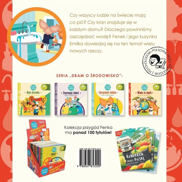 Czy wszyscy ludzie na ¿wiecie maj¿ co pi¿? Czy kran znajduje si¿ w kädym domu? Dlaczego powinni¿my oszcz¿dzä wod¿? Fenek i jego kuzynka Emilka dowiedz¿ si¿ na ten temat wielu nowych rzeczy. Dzi¿ki tej ksi¿¿eczce Twoje dziecko:Dowie si¿, ¿e s¿ na ¿wiecie obszary, w których brakuje wody. Zrozumie, dlaczego nale¿y j¿ szanowä. Pozna sposoby pomocy osobom nie maj¿cym dost¿pu do czystej wody. B¿dzie uczy¿ si¿ wräliwöci na potrzeby innych ludzi. Poza dostosowan¿ do wieku dzieci tre¿ci¿ i pi¿knymi, kolorowymi ilustracjami, ksi¿¿ka zawiera równie¿ wiele dodatkowych materiäów:Pomys¿y na ciekawe sp¿dzenie czasu z dzieckiem po przeczytaniu ksi¿¿eczki. Wypowiedzi eksperta Nasze bajki to idealny sposób na przyjemne, ale i efektywne sp¿dzenie czasu z maluchem. To nie tylko bajka "do poduszki", ale cö o wiele wi¿cej. Nie tylko ksi¿¿eczka do jednorazowego przeczytania, a pomoc edukacyjna i wychowawcza.