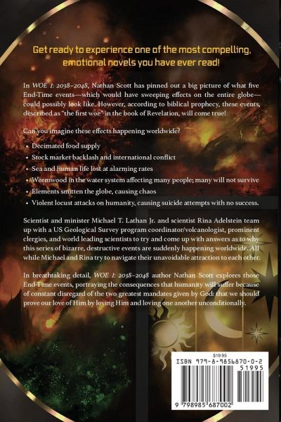 Get ready to experience one of the most compelling, emotional novels you have ever read! In WOE 1: 2038-2048, Nathan Scott has pinned out a big picture of what five End-Time events-which would have sweeping effects on the entire globe-could possibly look like. However, according to biblical prophecy, these events, described as "the first woe" in the book of Revelation, will come true! Can you imagine these effects happening worldwide? ¿ Decimated food supply¿ Stock market backlash and international conflict¿ Sea and human life lost at alarming rates¿ Wormwood in the water system affecting many people; many will not survive¿ Elements smitten across the globe, causing chaos¿ Violent locust attacks on humanity, causing suicide attempts with no success. Scientist and minister Michael T. Lathan Jr. and scientist Rina Adelstein team up with a, US Geological Survey program coordinator/volcanologist, prominent clergies, and world leading scientists to try and come up with answers as to why this series of bizarre, destructive events are suddenly happening worldwide. All while Michael and Rina try to navigate their unavoidable attraction to each other. In breathtaking detail, WOE 1: 2038-2048 author Nathan Scott explores those End-Time events, portraying the consequences that humanity will suffer because of constant disregard of the two greatest mandates given by God: that we should prove our love of Him by loving Him and loving one another unconditionally.
