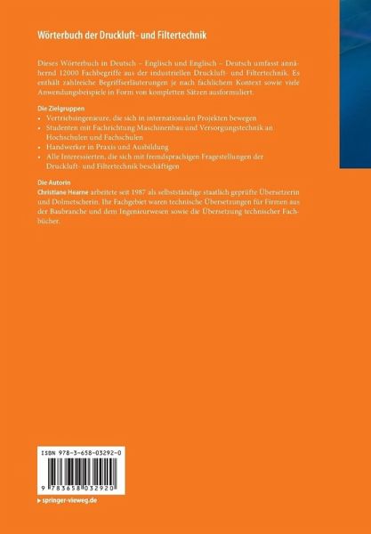 Dieses Wörterbuch in Deutsch - Englisch und Englisch - Deutsch umfasst annähernd 12000 Fachbegriffe aus der industriellen Druckluft- und Filtertechnik. Es enthält zahlreiche Begriffserläuterungen je nach fachlichem Kontext sowie viele Anwendungsbeispiele in Form von kompletten Sätzen ausformuliert.