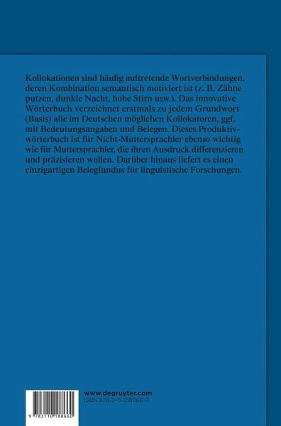 Collocations are frequently occurring combinations of words with a semantic motivation behind the link (e.g. brush teeth, dark night, high forehead etc.). This innovative dictionary registers for each base-word all the collocators possible in German, together, where appropriate, with their meanings and instances of their use. This productive dictionary is of equal value for non-native speakers and for native-speakers who wish to express themselves in a more precise and differentiated manner. In addition, it provides a unique repository of examples for linguistic research.