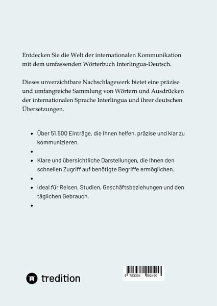 Entdecken Sie die Welt der internationalen Kommunikation mit dem umfassenden Interlingua-Deutsch Wörterbuch. Dieses unverzichtbare Nachschlagewerk bietet eine präzise und umfangreiche Sammlung von Wörtern und Ausdrücken der Plansprache Interlingua und ihrer deutschen Übersetzungen.Hauptmerkmale:Umfangreiche Wortliste: Über 51.500 Einträge, die Ihnen helfen, präzise und klar zu kommunizieren.Einfache Struktur: Klare und übersichtliche Darstellungen, die Ihnen den schnellen Zugriff auf benötigte Begriffe ermöglichen.Praktische Anwendung: Ideal für Reisen, Studien, Geschäftsbeziehungen und den täglichen Gebrauch.