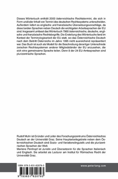 Dieses Wörterbuch enthält 2000 österreichische Rechtstermini, die sich in Form und/oder Inhalt von Termini des deutschen Rechtssystems unterscheiden. Außerdem liefert es englische und französische Übersetzungsvorschläge, da diese beiden Sprachen neben Deutsch die wichtigsten Arbeitssprachen der EU sind. Insgesamt umfasst das Wörterbuch 7960 österreichische, deutsche, englische und französische Rechtsbegriffe. Die Erstellung des Wörterbuchs fand im Kontext der Terminologiearbeit der EU statt, wo das Österreichische Deutsch nach dem Beitritt Österreichs im Jahre 1995 nicht ausreichend repräsentiert war. Das Buch ist auch als Modell für die Beschreibung derartiger Unterschiede zwischen Rechtssystemen anderer Mitgliedsländer der EU anzusehen, die sich eine gemeinsame Sprache teilen. Denn 8 der 24 EU-Amtssprachen sind plurizentrische Sprachen.