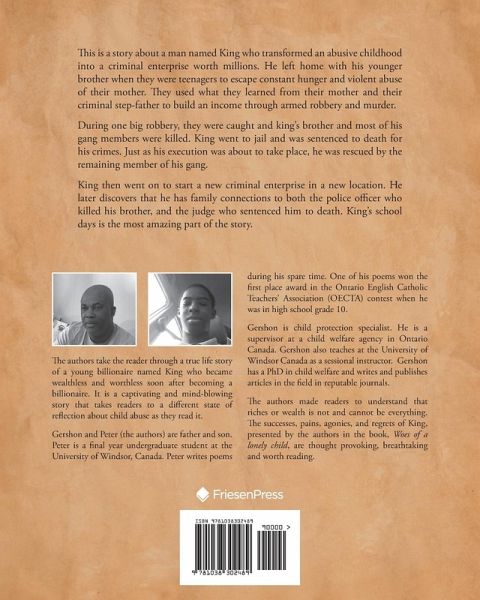 The authors take the reader through a true life story of a young billionaire named King who became wealthless and worthless soon after becoming a billionaire. It is a captivating and mind-blowing story that takes readers to a different state of reflection about child abuse as they read it. Gershon and Peter (the authors) are father and son. Peter is a final year undergraduate student at the University of Windsor, Canada. Peter writes poems during his spare time. One of his poems won the first place award in the Ontario English Catholic Teachers' Association (OECTA) contest when he was in high school grade 10. Gershon is child protection specialist. He is a supervisor at a child welfare agency in Ontario Canada. Gershon also teaches at the University of Windsor Canada as a sessional instructor. Gershon has a PhD in child welfare and writes and publishes articles in the field in reputable journals. The authors made readers to understand that riches or wealth is not and cannot be everything. The successes, pains, agonies, and regrets of King, presented by the authors in the book, Woes of a lonely child, are thought provoking, breathtaking and worth reading.