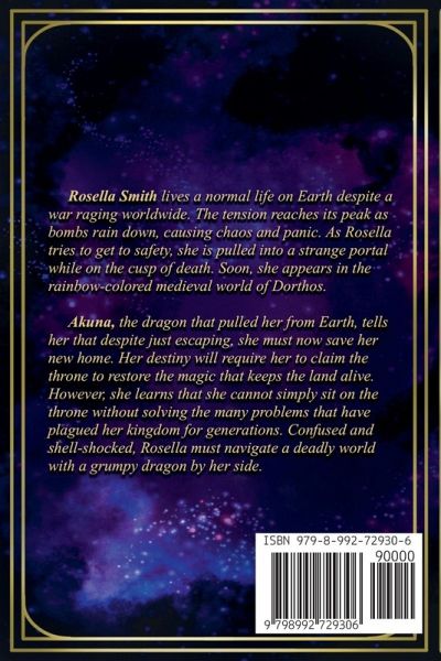 Rosella Smith lives a normal life on Earth despite a war raging worldwide. The tension reaches its peak as bombs rain down, causing chaos and panic. As Rosella tries to get to safety, she is pulled into a strange portal while on the cusp of death. Soon, she appears in the rainbow-colored medieval world of Dorthos. Akuna, the dragon that pulled her from Earth, tells her that despite just escaping, she must now save her new home. Her destiny will require her to claim the throne to restore the magic that keeps the land alive. However, she learns that she cannot simply sit on the throne without solving the many problems that have plagued her kingdom for generations. Confused and shell-shocked, Rosella must navigate a deadly world with a grumpy dragon by her side.