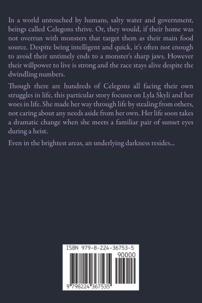 In a world untouched by humans, salty water and government, beings called Celegons thrive. Or, they would, if their home was not overrun with monsters that target them as their main food source. Despite being intelligent and quick, it's often not enough to avoid their untimely ends to a monster's sharp jaws. However their willpower to live is strong and the race stays alive despite the dwindling numbers. Though there are hundreds of Celegons all facing their own struggles in life, this particular story focuses on Lyla Skyli and her woes in life. She made her way through life by stealing from others, not caring about any needs aside from her own. Her life soon takes a dramatic change when she meets a familiar pair of sunset eyes during a heist.