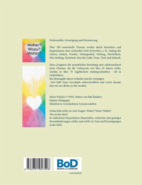 Ermutigende Einsichten und Inspirationen einer suchenden Seele zu über 100 existentiellen Themen wie z.B.: Anfang, Bewusstseinserweiterung, Danken, Einheit, Freiheit, Frieden, Geborgenheit, Heilung, Herrlichkeit, Innerem Kampf, Liebe, Licht, Mut, Orientierung, Reifung, Sicherheit, Sinn des Leids, Treue, Trost, Ziel und Zukunft.Aus über 70 Tagebüchern, geschrieben während 45 Jahren, werden hier in alphabetischer Reihenfolge berührende Gedichte, Zeugnisse der persönlichen Beziehung zum auferstandenen Jesus Christus veröffentlicht. Besonders in herausfordernden Krisenzeiten mit zahlreichen ausweglos erscheinenden Situationen erlebte die Verfasserin, dass sie Kraft, Hilfe, Trost und Ermutigung durch die direkte Hinwendung zu Jesus Christus erfuhr.Neben den zahlreichen, in der Stille geschenkt bekommenen Gedichten werden auch 12 Gemälde der Verfasserin veröffentlicht.Das Anliegen dieser Herausgabe ist die Weitergabe der Erfahrung, dass Gott Liebe ist und auch heute noch zu sehnsüchtigSuchenden spricht und jeden ermutigen möchte, eine direkte persönliche Beziehung zu Ihm zu suchen.