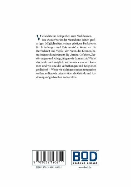 Vielleicht eine Gelegenheit zum Nachdenken.Wie wunderbar ist der Mensch mit seinen großartigen Möglichkeiten, seinen geistigen Funktionen für Erfindungen und Erkenntnis! - Wenn wir die Herrlichkeit und Vielfalt der Natur, des Kosmos, betrachten und andererseits die Unruhe. Gefahren, Zerstörungen und Kriege, fragen wir dann nicht: Wie ist das heute noch möglich, wie konnte es so weit kommen und wo sind die Verheißungen und Religionen geblieben? - Wenn wir nicht gemeinsam untergehen wollen, sollten wir intensiv über die Gründe und Änderungsmöglichkeiten nachdenken.