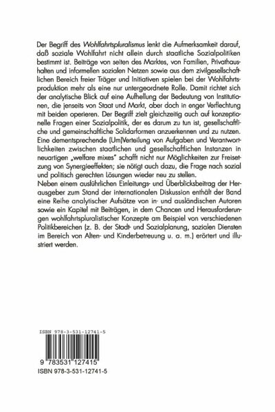Der Begriff des 'Wohlfahrtspluralismus' lenkt die Aufmerksamkeit darauf, daß soziale Wohlfahrt nicht allein durch staatliche Sozialpolitiken bestimmt ist. Beiträge von seiten des Marktes, von Familien, Privathaushalten und informellen sozialen Netzen sowie aus dem zivilgesellschaftlichen Bereich freier Träger und Initiativen spielen bei der Wohlfahrtsproduktion mehr als eine nur untergeordnete Rolle. Damit richtet sich der analytische Blick auf eine Aufhellung der Bedeutung von Institutionen, die jenseits von Staat und Markt, aber doch in enger Verflechtung mit beiden operieren. Der Begriff zielt gleichzeitig auch auf konzeptionelle Fragen einer Sozialpolitik, der es darum zu tun ist, gesellschaftliche und gemeinschaftliche Solidarformen anzuerkennen und zu nutzen. Eine dementsprechende (Um)Verteilung von Aufgaben und Verantwortlichkeiten zwischen staatlichen und gesellschaftlichen Instanzen in neuartigen "welfare mixes" schafft nicht nur Möglichkeiten zur Freisetzung von Synergieeffekten; sie nötigt auch dazu, die Frage nach sozial und politisch gerechten Lösungen wieder neu zu stellen. Neben einem ausführlichen Einleitungs- und Überblicksbeitrag der Herausgeber zum Stand der internationalen Diskussion enthält der Band eine Reihe analytischer Aufsätze von in- und ausländischen Autoren sowie ein Kapitel mit Beiträgen, in dem Chancen und Herausforderungen (z. B. der Stadt- und Sozialplanung, von sozialen Diensten im Bereich von Alten- und Kinderbetreuung u. a. m.) erörtert und illustriert werden.