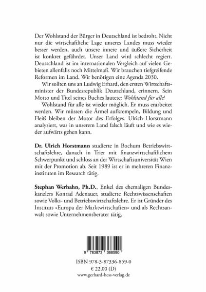Der Wohlstand der Bürger in Deutschland ist bedroht. Nicht nur die wirtschaftliche Lage unseres Landes muss wieder besser werden, auch unsere innere und äußere Sicherheit ist konkret gefährdet. Unser Land wird schlecht regiert. Deutschland ist im internationalen Vergleich auf vielen Gebieten allenfalls noch Mittelmaß. Wir brauchen tiefgreifende Reformen im Land. Wir benötigen eine Agenda 2030.Wir sollten uns an Ludwig Erhard, den ersten Wirtschaftsminister der Bundesrepublik Deutschland, erinnern. Sein Motto und Titel seines Buches lautete: Wohlstand für alle!Wohlstand für alle ist wieder möglich. Er muss erarbeitet werden. Wir müssen die Ärmel aufkrempeln, Bildung und Fleiß bleiben der Motor des Erfolges. Ulrich Horstmann analysiert, was in unserem Land falsch läuft und wie es wieder aufwärts gehen kann.
