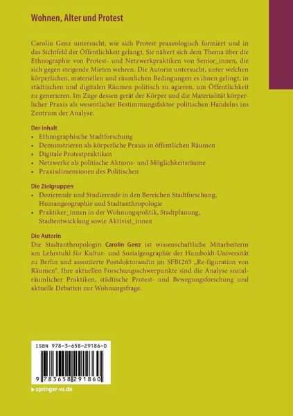 Carolin Genz untersucht, wie sich Protest praxeologisch formiert und in das Sichtfeld der Öffentlichkeit gelangt. Sie nähert sich dem Thema über die Ethnographie von Protest- und Netzwerkpraktiken von Senior_innen, die sich gegen steigende Mieten wehren. Die Autorin untersucht, unter welchen körperlichen, materiellen und räumlichen Bedingungen es ihnen gelingt, in städtischen und digitalen Räumen politisch zu agieren, um Öffentlichkeit zu generieren. Im Zuge dessen gerät der Körper und die Materialität körperlicher Praxis als wesentlicher Bestimmungsfaktor politischen Handelns ins Zentrum der Analyse.