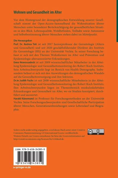 Prof. Dr. Andrea Teti ist seit 2017 Juniorprofessor der Gerontologie (Altern und Gesundheit) und seit 2020 geschäftsführender Direktor des Instituts für Gerontologie (IfG) an der Universität Vechta. In seiner Forschung befasst er sich mit den Themen Wohnformen im Alter und Prävention und Epidemiologie altersassoziierter Erkrankungen. Enno Nowossadeck ist seit 2009 wissenschaftlicher Mitarbeiter in der Abteilung Epidemiologie und Gesundheitsmonitoring des Robert Koch Instituts. Sein Arbeitsschwerpunkt liegt im Bereich von Health Demography. Insbesondere befasst er sich mit den Auswirkungen des demografischen Wandels auf die Gesundheitsversorgung und ihre Sektoren. Dr.in Judith Fuchs ist seit 2008 wissenschaftliche Mitarbeiterin in der Abteilung Epidemiologie und Gesundheitsmonitoring des Robert Koch Instituts. Ihre Arbeitsschwerpunkte liegen im Themenbereich muskuloskelettalen Erkrankungen und Gesundheit im Alter, wo sie Studien konzipiert, durchführt und auswertet. Harald Künemund ist Professor für Forschungsmethoden an der Universität Vechta. Seine Forschungsschwerpunkte sind Gesellschaftliche Partizipation älterer Menschen, Generationenbeziehungen sowie Lebenslauf und Biographie.