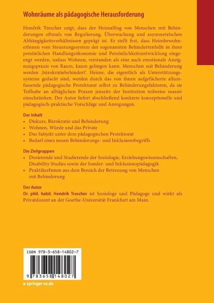 Hendrik Trescher zeigt, dass der Heimalltag von Menschen mit Behinderungen oftmals von Regulierung, Überwachung und asymmetrischen Abhängigkeitsverhältnissen geprägt ist. Er stellt fest, dass HeimbewohnerInnen vom Steuerungssystem der sogenannten Behindertenhilfe in ihrer persönlichen Handlungsökonomie und Persönlichkeitsentwicklung eingeengt werden, sodass Wohnen, verstanden als eine auch emotionale Aneignungspraxis von Raum, kaum gelingen kann. Menschen mit Behinderung werden 'bürokratiebehindert'. Heime, die eigentlich als Unterstützungssysteme gedacht sind, werden durch das von ihnen aufgefächerte allumfassende pädagogische Protektorat selbst zu Behinderungsfaktoren, da sie Teilhabe an alltäglichen Praxen jenseits der Institution teilweise massiv einschränken. Der Autor liefert abschließend konkrete konzeptionelle und pädagogisch-praktische Vorschläge und Anregungen.
