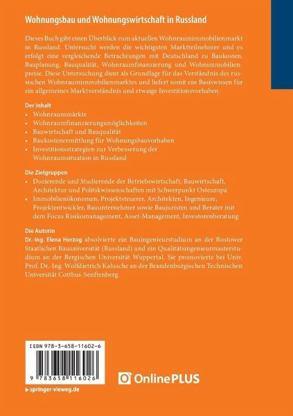 Wohnraummärkte.- Wohnraumfinanzierungsmöglichkeiten.- Bauwirtschaft und Bauqualität.- Baukostenermittlung für Wohnungsbauvorhaben.- Investitionsstrategien zur Verbesserung der Wohnraumsituation in Russland.