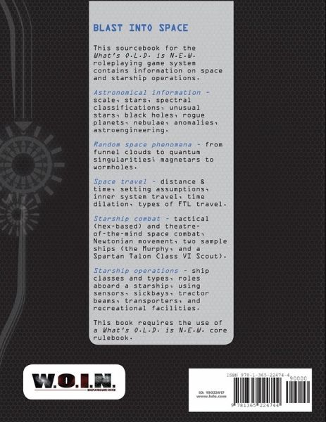 This sourcebook for the What's O.L.D. is N.E.W. roleplaying game system contains information on space and starship operations. Astronomical information - scale, stars, spectral classifications, unusual stars, black holes, rogue planets, nebulae, anomalies, astroengineering. Random space phenomena - from funnel clouds to quantum singularities; magnetars to wormholes. Space travel - distance & time, setting assumptions, inner system travel, time dilation, types of FTL travel. Starship combat - tactical (hex-based) and theatreof- the-mind space combat, Newtonian movement, two sample ships (the Murphy, and a Spartan Talon Class VI Scout). Starship operations - ship classes and types, roles aboard a starship, using sensors, sickbays, tractor beams, transporters, and recreational facilities. This book requires the use of a What's O.L.D. is N.E.W. core rulebook.